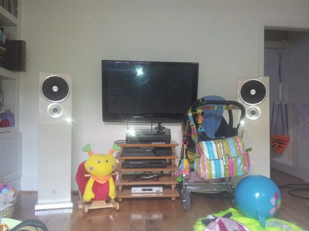 Living room setup with TV, speakers, stroller, and children's toys.